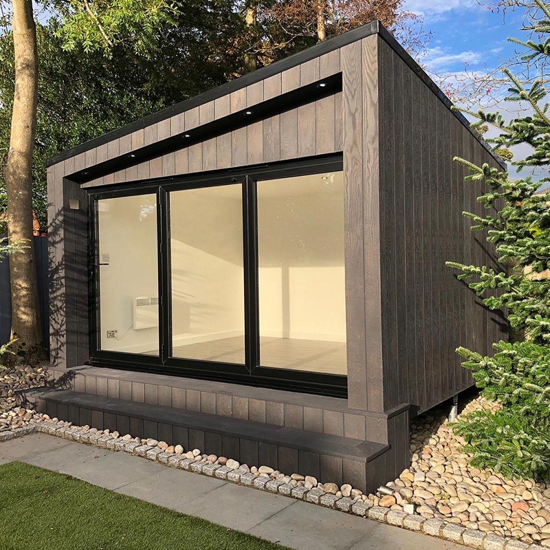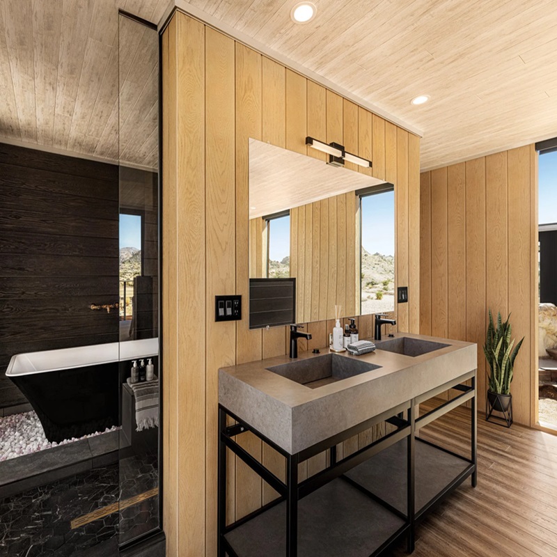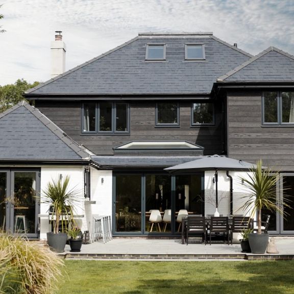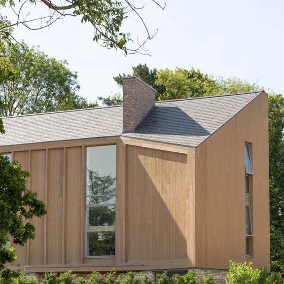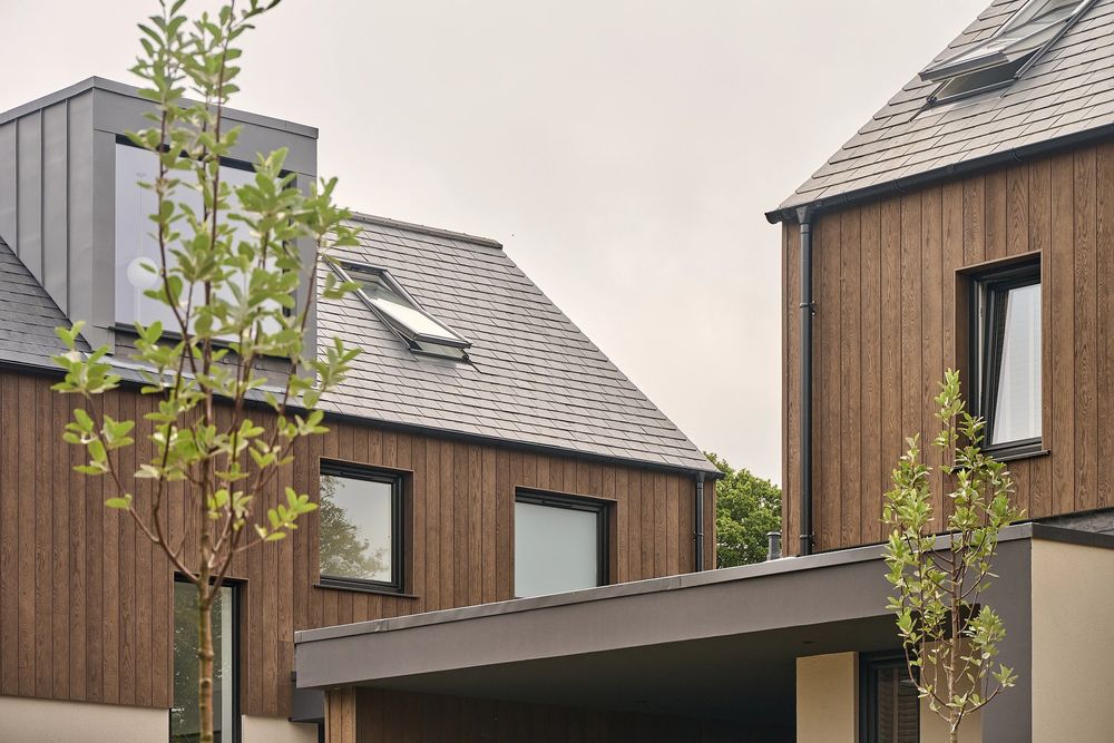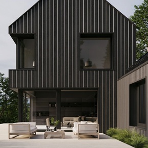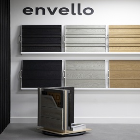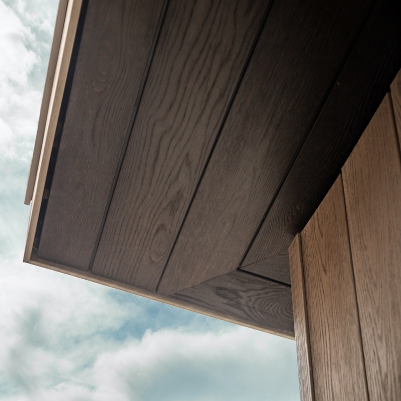 Фасадні дошки Millboard Envello Shadow Line+ профільовані під скошеними кутами, щоб запобігти скупченню води між двома профілями, а також допомогти дощовій воді змити поверхню облицювання. Паз, створений між дошками, дає візуальну чіткість окремих візерунків текстури.