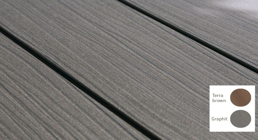 Дошки EasyDeck® GLACIER шириною 193 мм доступні в наступних кольорах: terra brown та graphite.