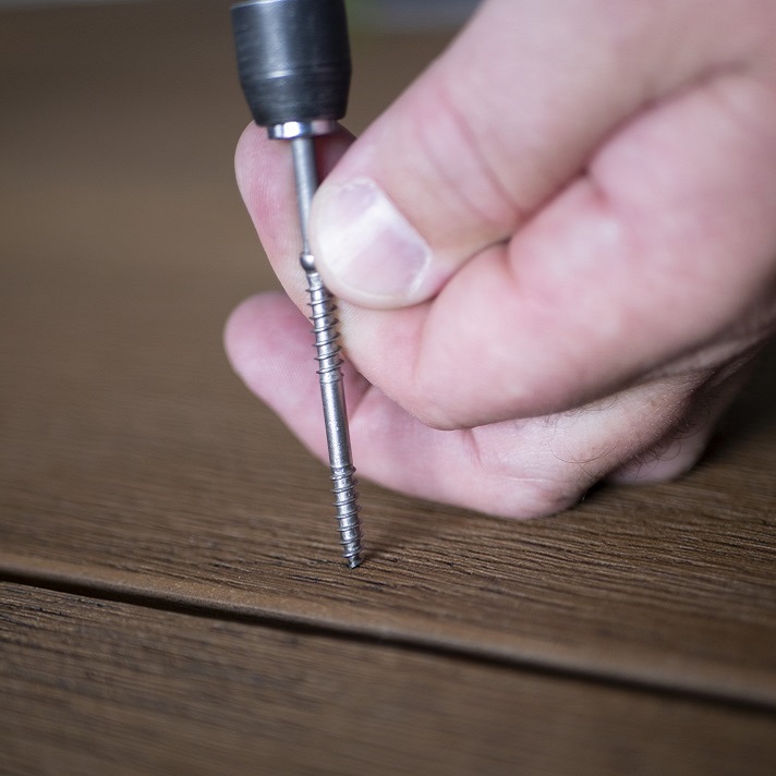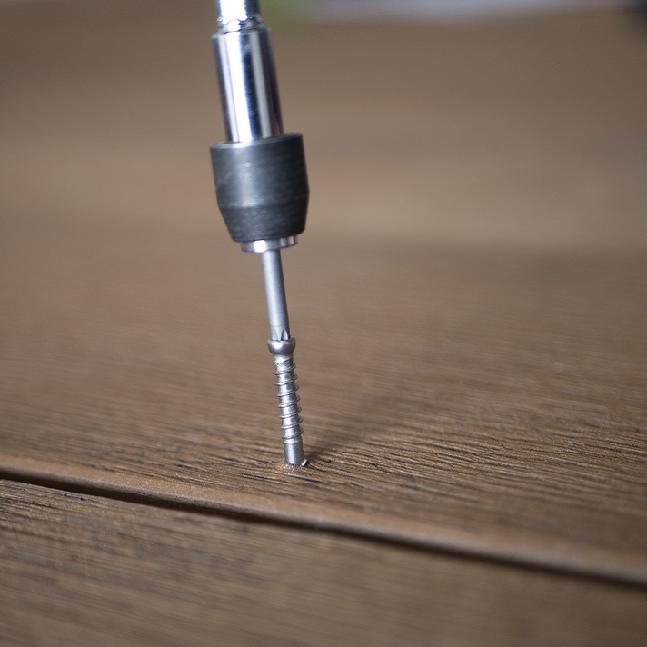 При кріпленні через лицьову поверхню плит немає необхідності попередньо свердлити, зенкувати або використовувати кліпси, просто закріпіть плити відповідно до нашого посібника з монтажу. Після вкручування шурупів інноваційне покриття Lastane® на дошці згинається назад над головками шурупів, залишаючи мінімальний слід. Виготовлені з нержавіючої сталі А2, шурупи мають самонарізний наконечник, шестигранну головку з внутрішнім шестигранником і покриті воском для зручності використання.